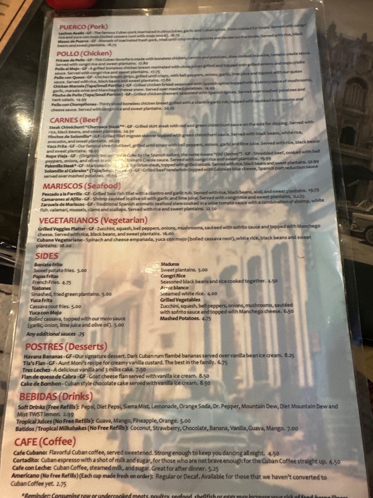 Shrimp sauteed in olive oil with garlic and lime juice. Served with congri rice and sweet plantains.