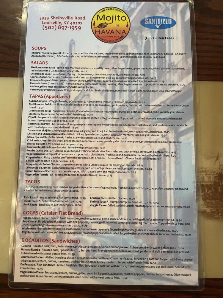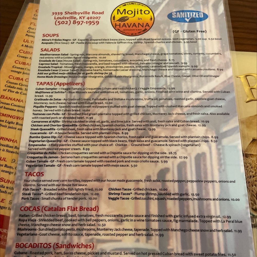 Introducing Mojito in Havana, a vibrant bar and seafood restaurant located in Louisville, KY. This trendy and classy establishment offers a unique dining experience with delivery and takeout options available. The menu features a variety of delicious options, including the Asopado Rice Soup Bowl, Mima's Frijoles Negro Soup, and Mediterranean Salad. Don't miss out on their flavorful Beef Empanadas and Rumba Queso Dip for a mouthwatering start to your meal. The lively atmosphere is enhanced by live music, making it the perfect spot for a night out with friends or a special dinner. With wheelchair accessibility, convenient parking, and free Wi-Fi, Mojito in Havana ensures a comfortable and enjoyable dining experience for all. Plan your visit and indulge in the flavors of Havana right here in Louisville.